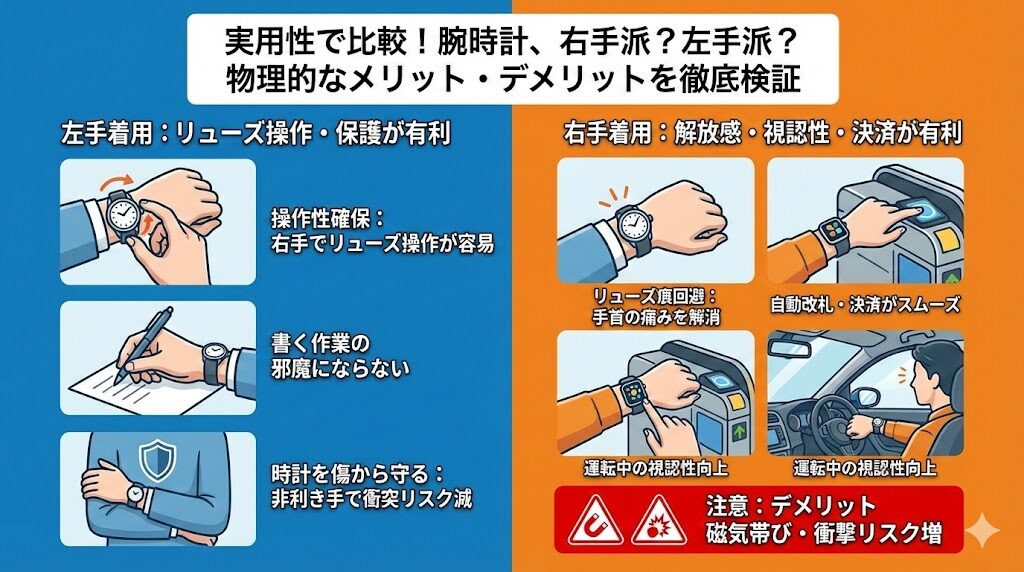 多くの時計が「左手着用」を前提に作られているため、恩恵は最大化されます。